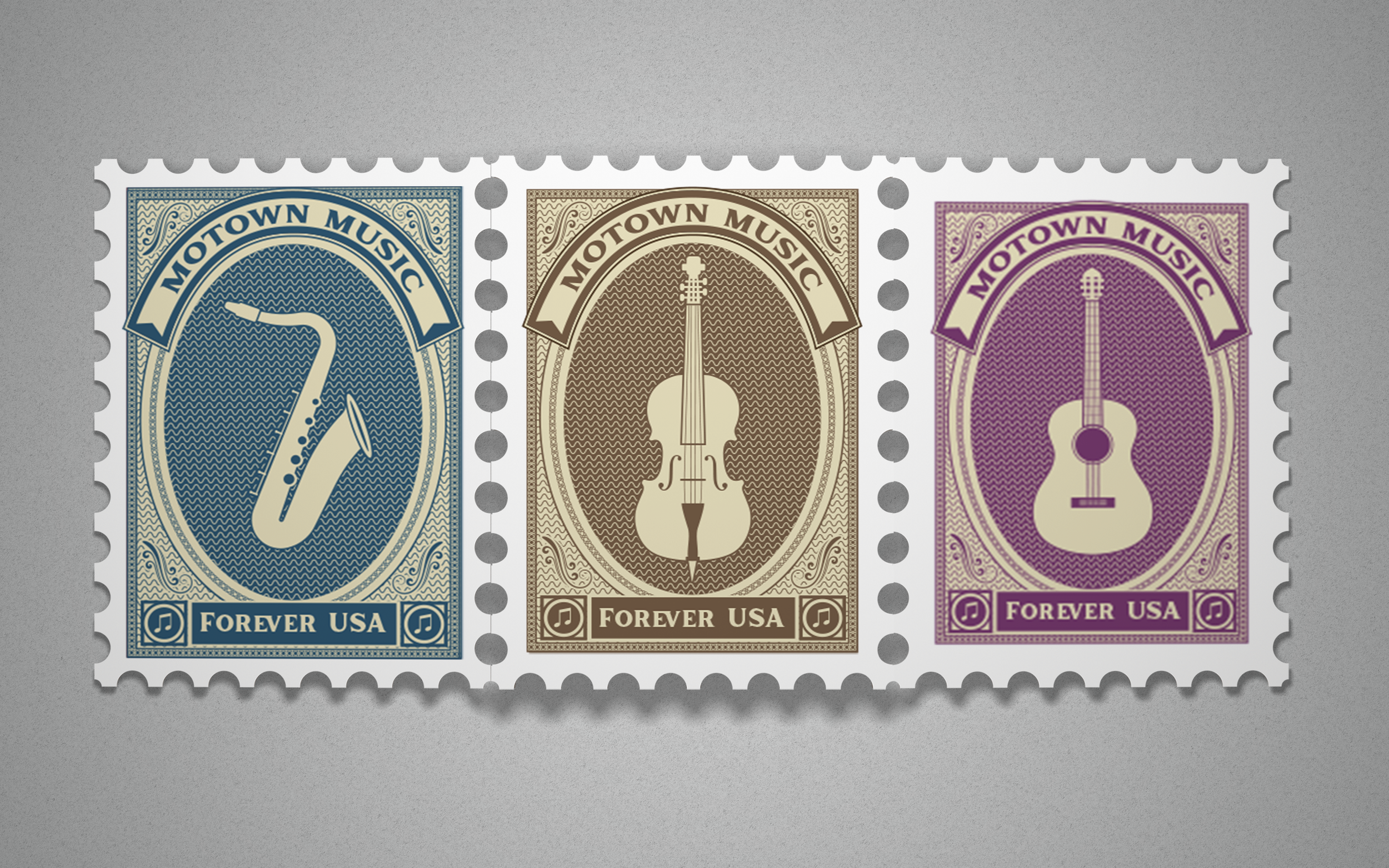 This stamp collection celebrates the rich history and beauty of Motown Music in Michigan. Bring some light to your postcards or letters with these 6 versions of the Motown Music stamp. Each stamp features one of the most prevalent instruments in blues music. There are also 6 alternate versions with the official “Forever USA.”